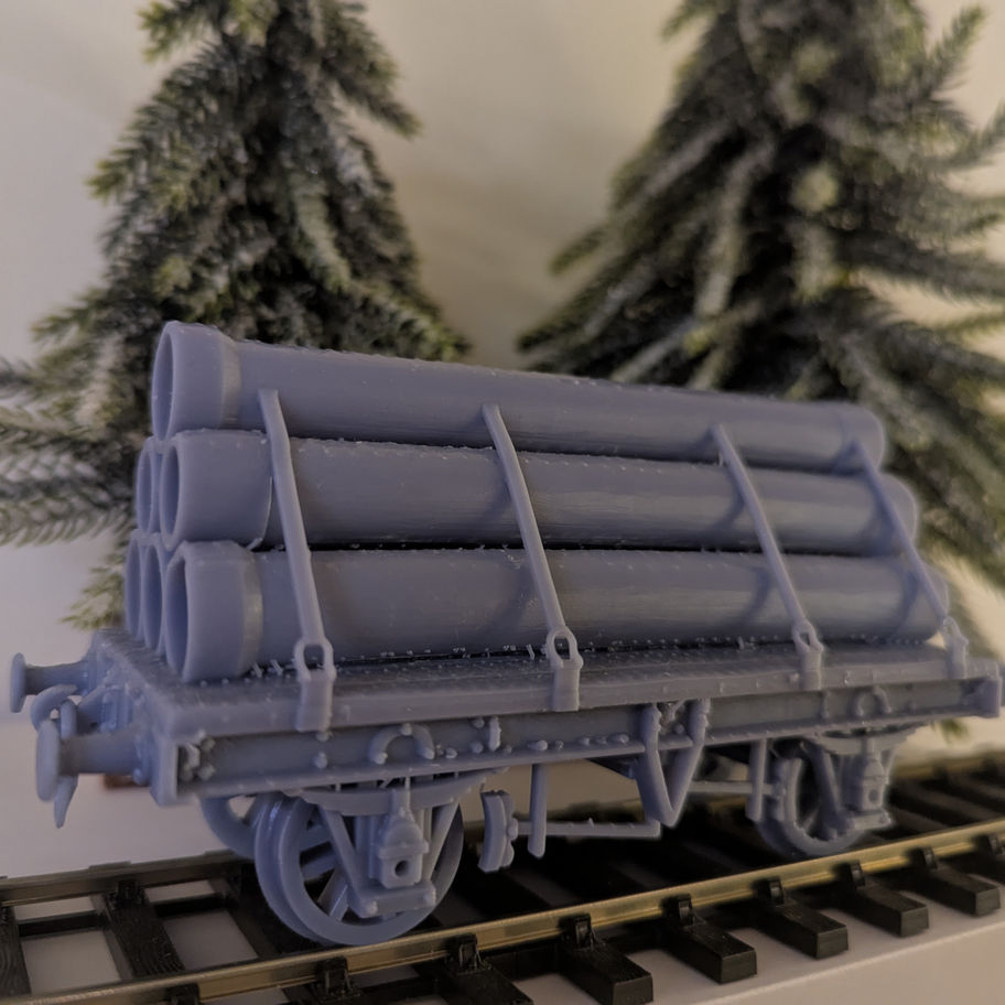 O Gauge Pipe Load Wagon approx 150mm length, fully assembled and supplied unpainted. Manufactured using high-quality resin 3D printing for sharp detail and accurate proportions. Supplied with 3D printed wheels and couplers, compatible with PECO PS627 wheelsets. Ideal for custom painting, weathering, and use on O Gauge model railway layouts or dioramas.